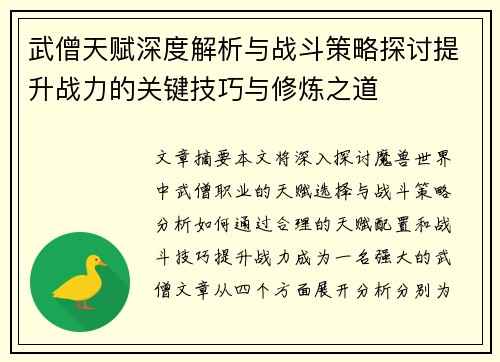 武僧天赋深度解析与战斗策略探讨提升战力的关键技巧与修炼之道