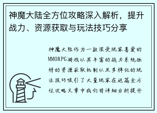 神魔大陆全方位攻略深入解析,提升战力、资源获取与玩法技巧分享